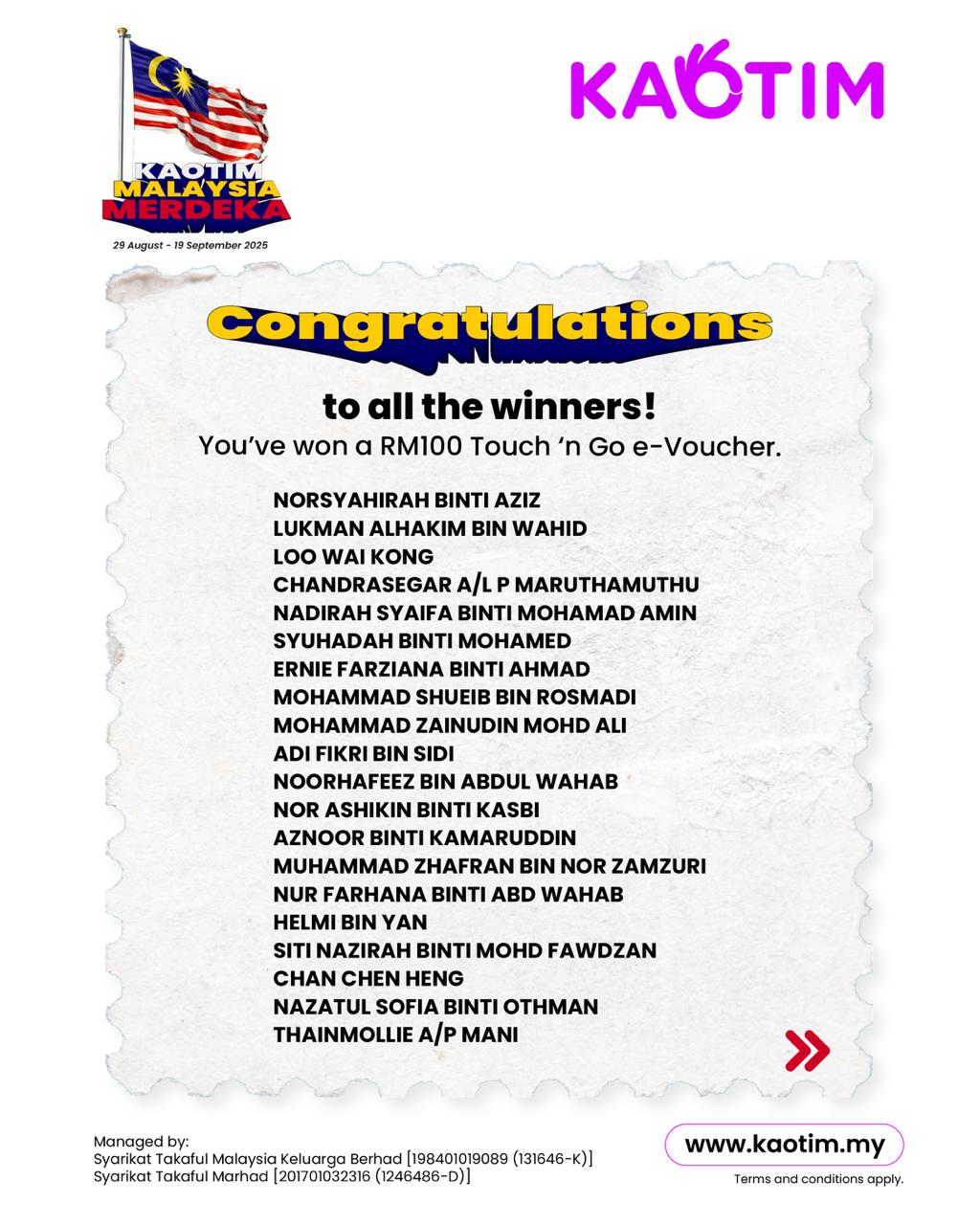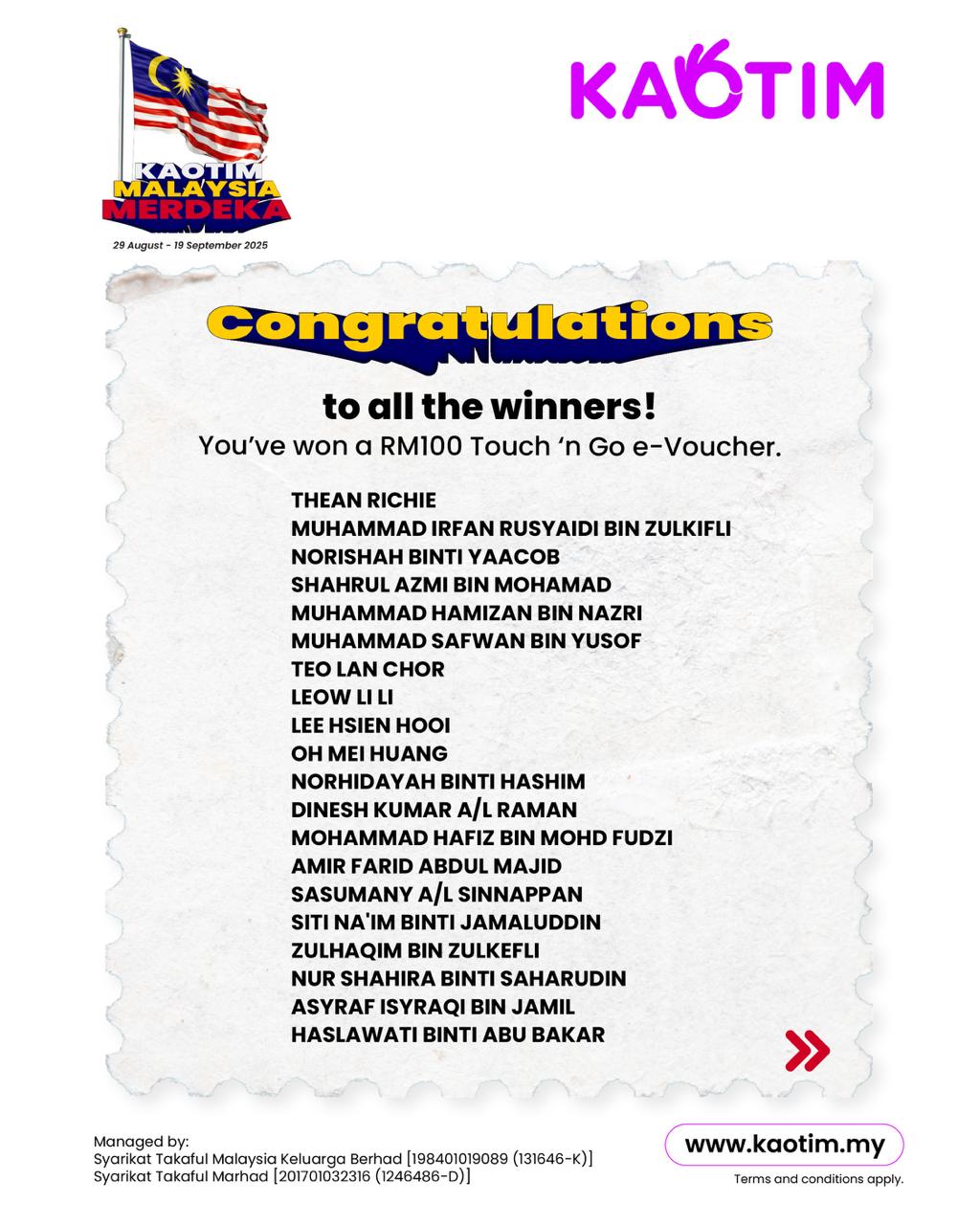 68 Winners x RM100 Touch ‘n Go e-Voucher